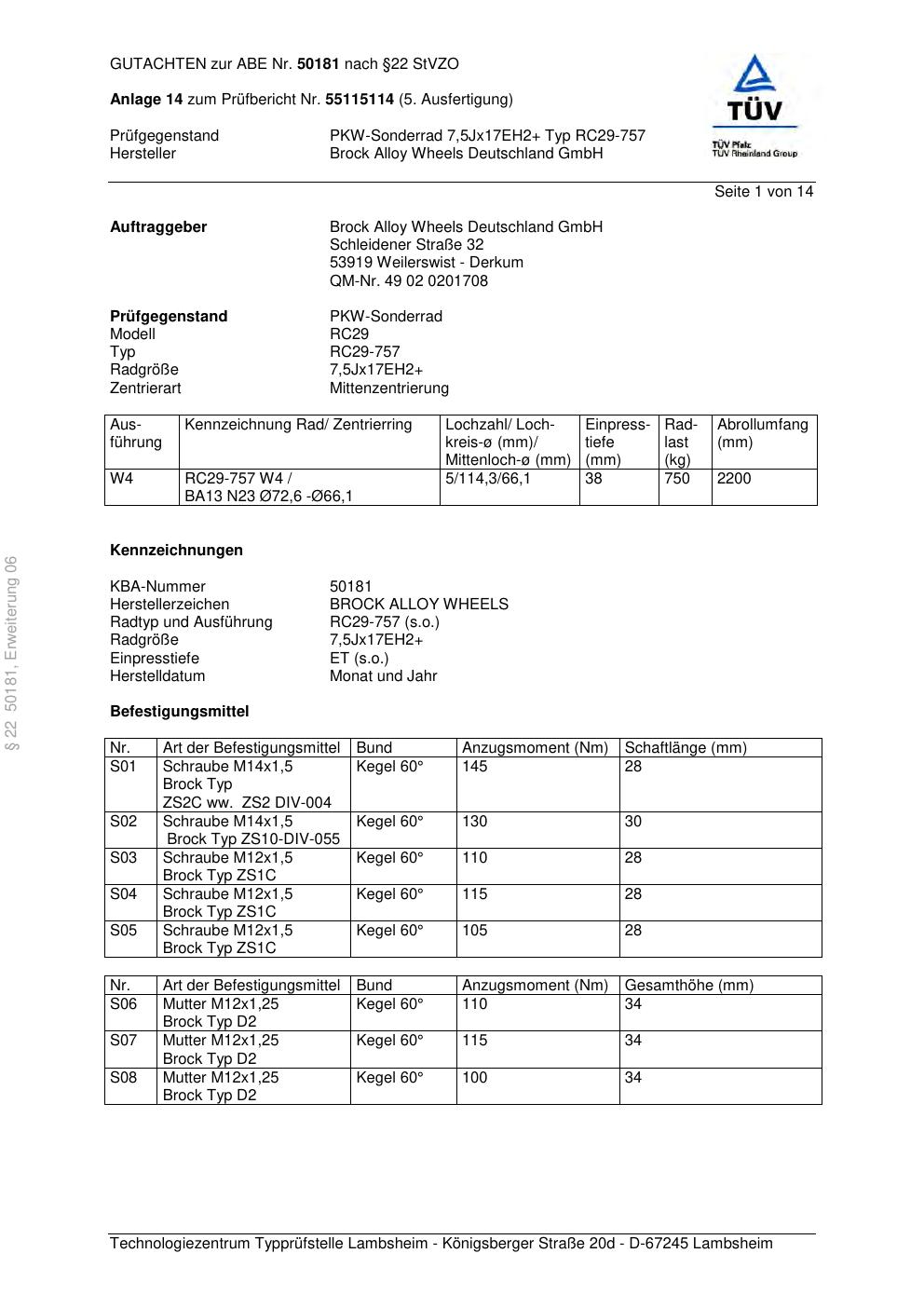 Dieses Gutachten (abe) bezieht sich auf die Alufelge Brock RC29-757 in der Ausführung ET 0, Mittenloch 0 mm (KBA 50181). Im PDF findest du typischerweise zulässige Reifengrößen, Auflagen/Anbauhinweise und – je nach Dokument – Hinweise zur Eintragung.