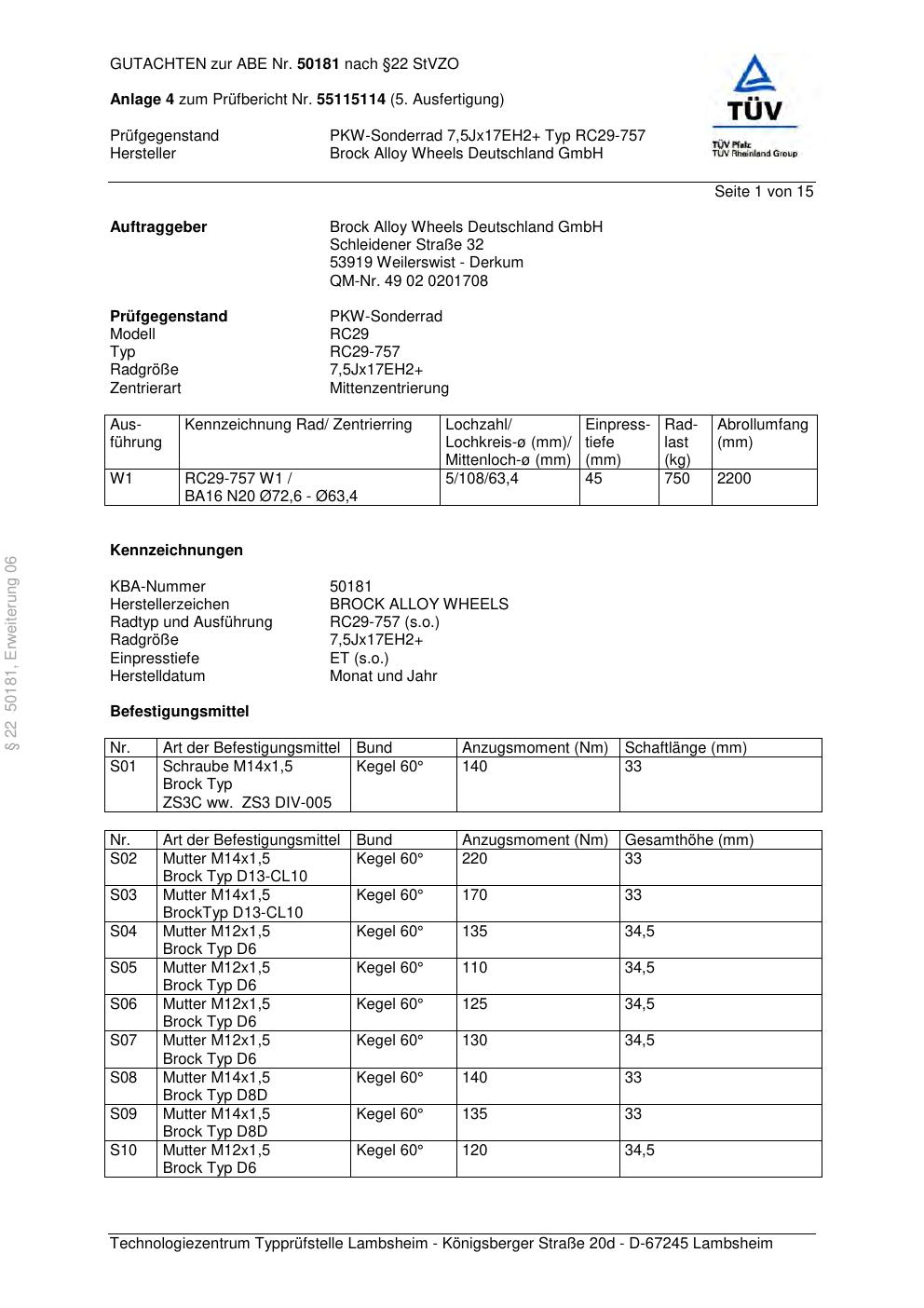 Dieses Gutachten (abe) bezieht sich auf die Alufelge Brock RC29-757 in der Ausführung ET 0, Mittenloch 0 mm (KBA 50181). Im PDF findest du typischerweise zulässige Reifengrößen, Auflagen/Anbauhinweise und – je nach Dokument – Hinweise zur Eintragung.