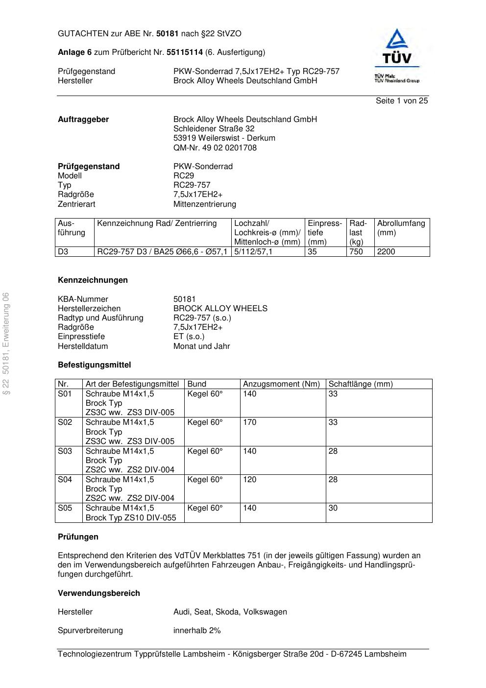Dieses Gutachten (abe) bezieht sich auf die Alufelge Brock RC29-757 in der Ausführung 8.5Jx19 ET 0, Mittenloch 0 mm (KBA 50181). Im PDF findest du typischerweise zulässige Reifengrößen, Auflagen/Anbauhinweise und – je nach Dokument – Hinweise zur Eintragung.