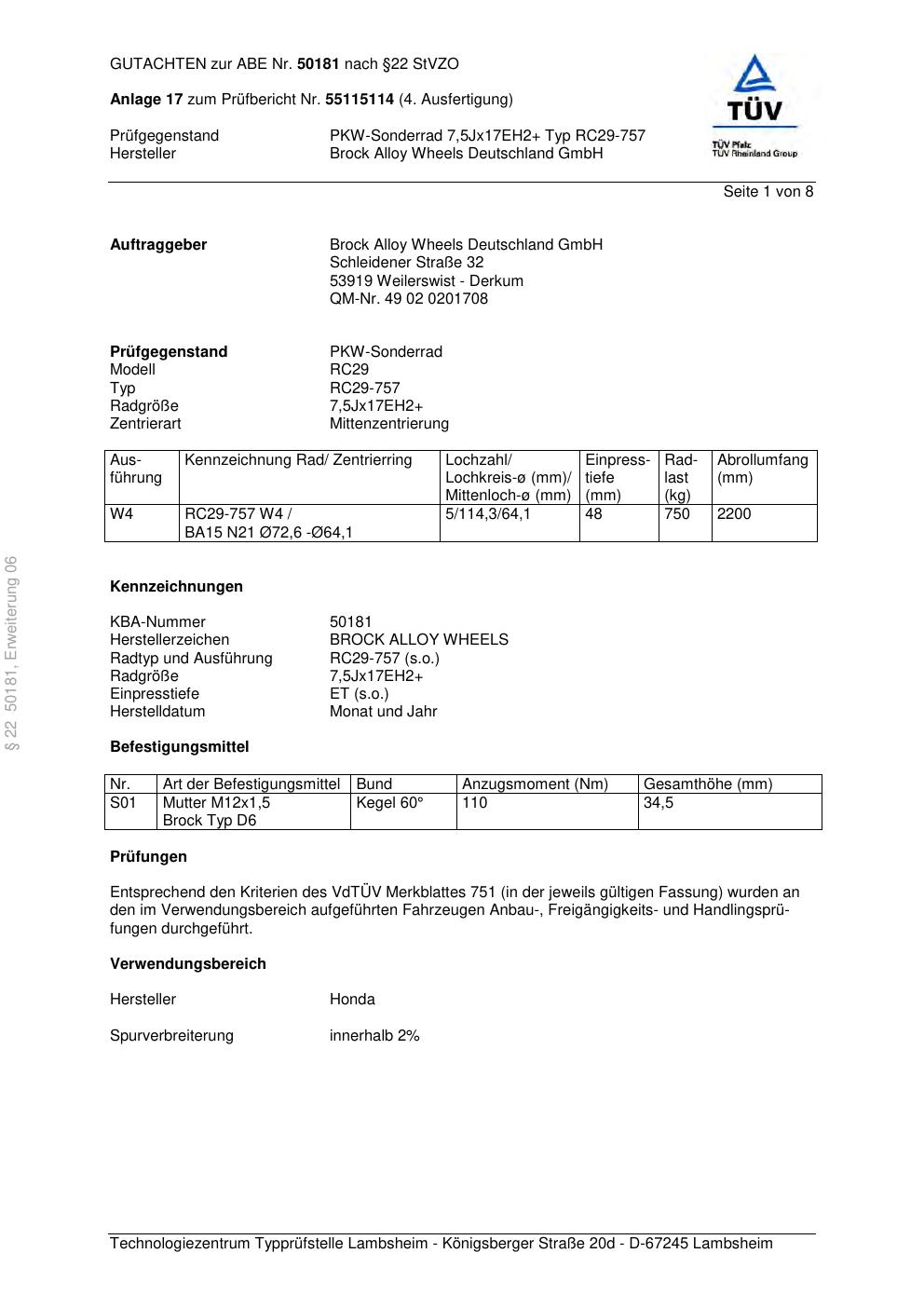 Dieses Gutachten (abe) bezieht sich auf die Alufelge Brock RC29-757 in der Ausführung ET 0, Mittenloch 0 mm (KBA 50181). Im PDF findest du typischerweise zulässige Reifengrößen, Auflagen/Anbauhinweise und – je nach Dokument – Hinweise zur Eintragung.