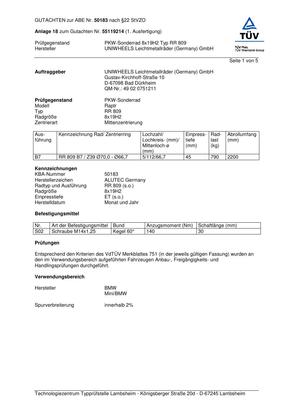 Dieses Gutachten (abe) bezieht sich auf die Alufelge ALUTEC RR 809 in der Ausführung 8Jx19 ET 0, Mittenloch 0 mm (KBA 50183). Im PDF findest du typischerweise zulässige Reifengrößen, Auflagen/Anbauhinweise und – je nach Dokument – Hinweise zur Eintragung.