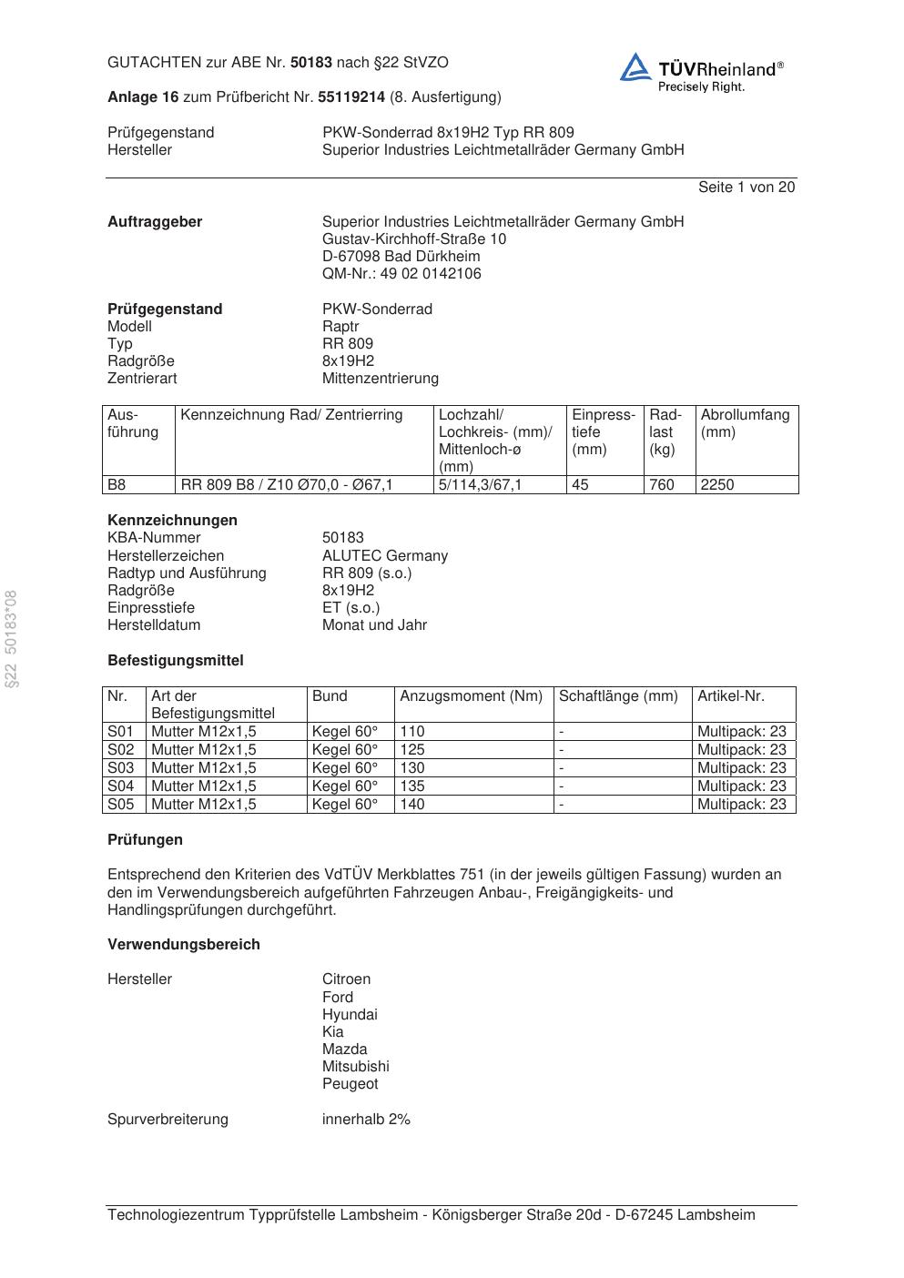 Dieses Gutachten (abe) bezieht sich auf die Alufelge ALUTEC RR 809 in der Ausführung 8Jx19 ET 0, Mittenloch 0 mm (KBA 50183). Im PDF findest du typischerweise zulässige Reifengrößen, Auflagen/Anbauhinweise und – je nach Dokument – Hinweise zur Eintragung.