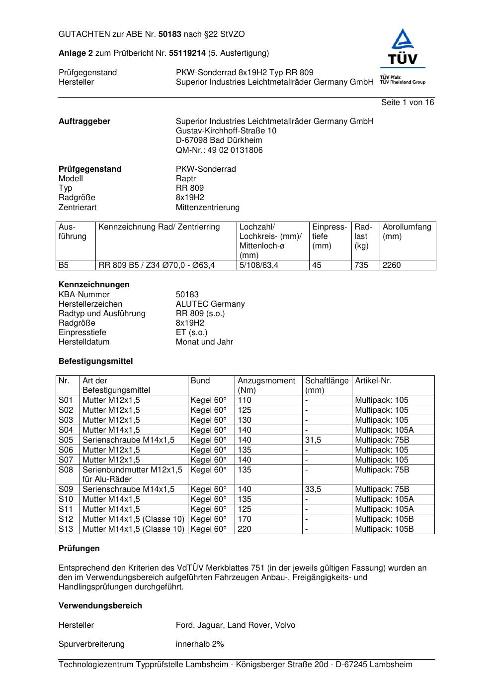 Dieses Gutachten (abe) bezieht sich auf die Alufelge ALUTEC RR 809 in der Ausführung 8Jx19 ET 0, Mittenloch 0 mm (KBA 50183). Im PDF findest du typischerweise zulässige Reifengrößen, Auflagen/Anbauhinweise und – je nach Dokument – Hinweise zur Eintragung.
