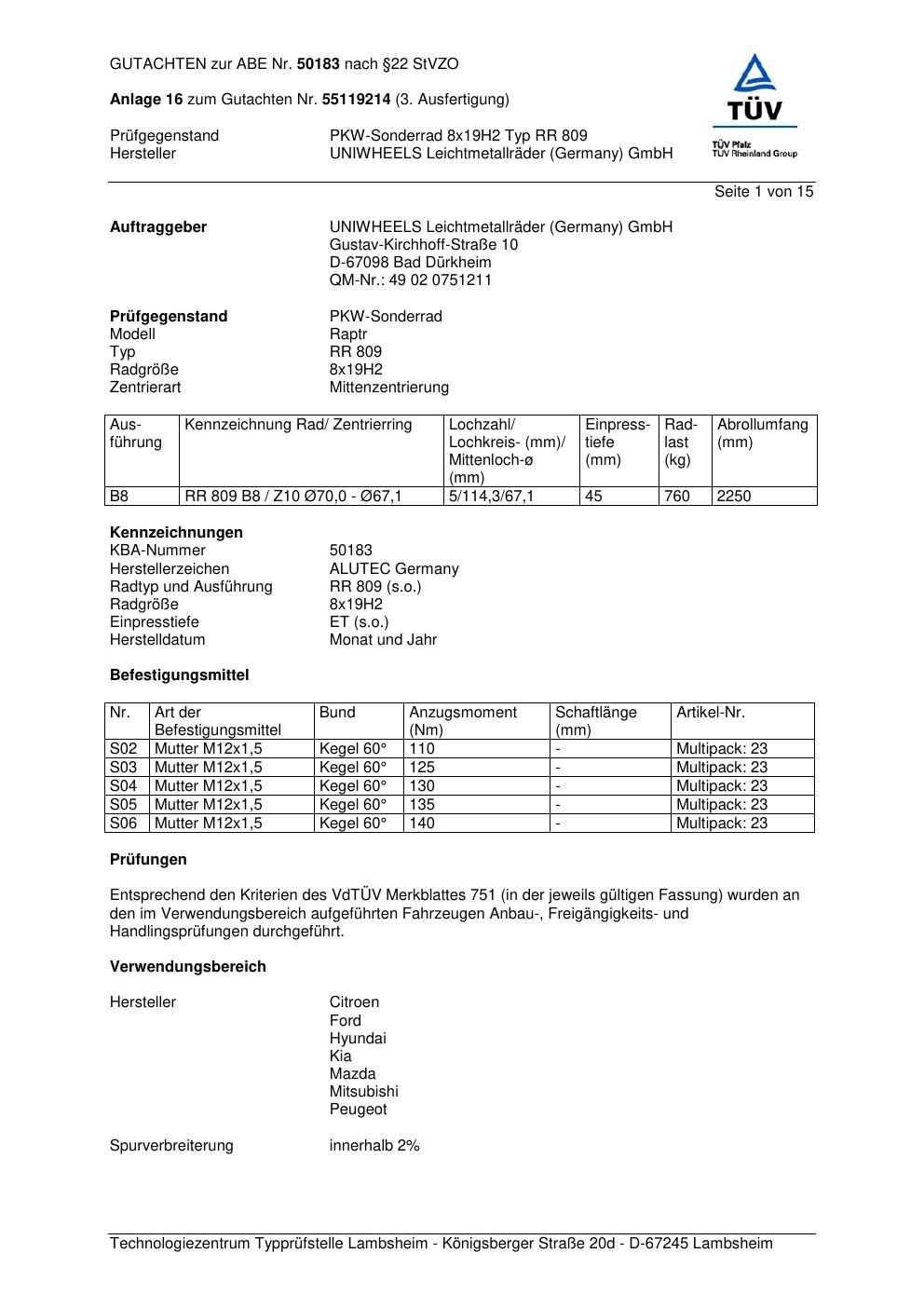 Dieses Gutachten (abe) bezieht sich auf die Alufelge ALUTEC RR 809 in der Ausführung 8Jx19 ET 0, Mittenloch 0 mm (KBA 50183). Im PDF findest du typischerweise zulässige Reifengrößen, Auflagen/Anbauhinweise und – je nach Dokument – Hinweise zur Eintragung.