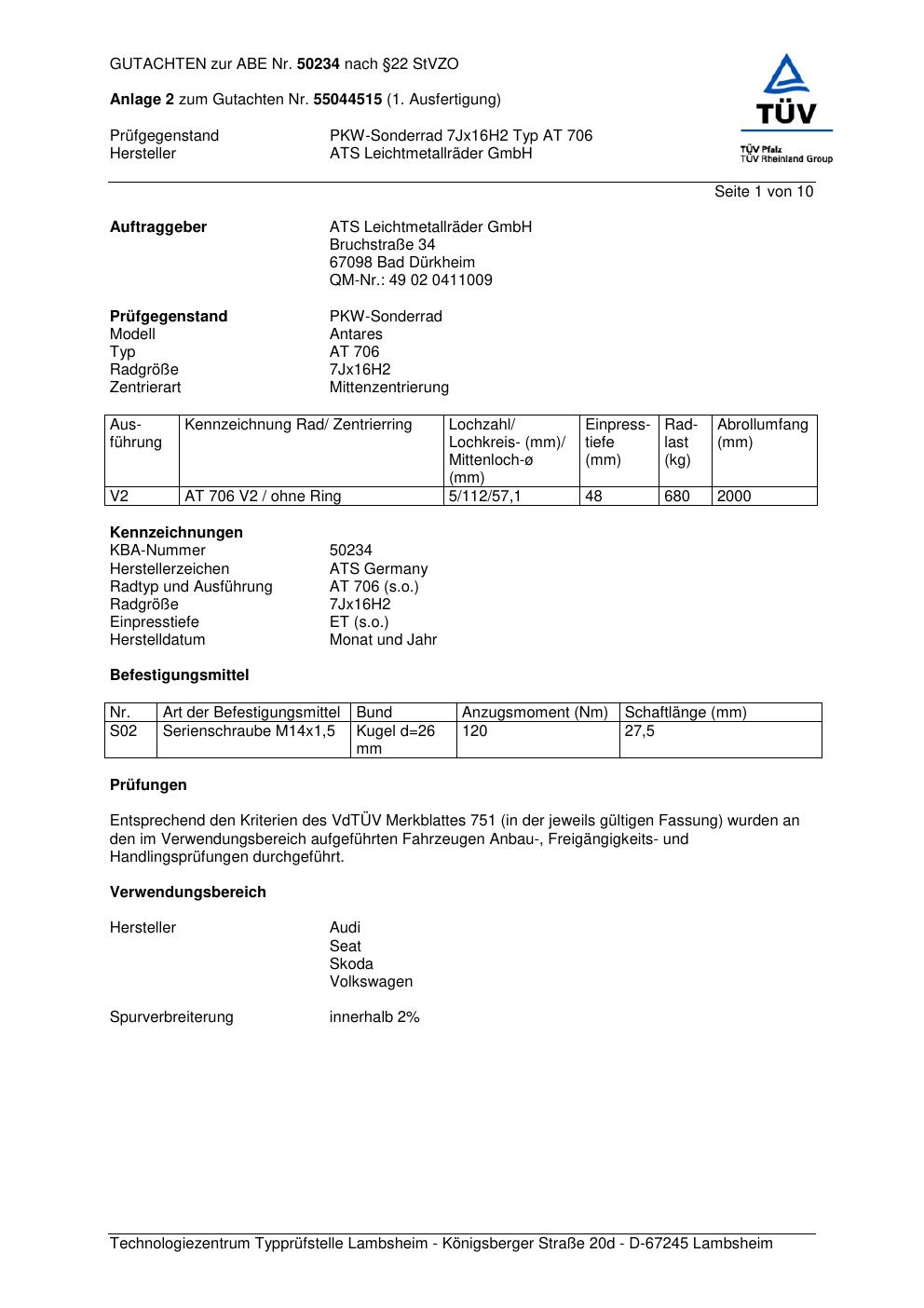 Dieses Gutachten (abe) bezieht sich auf die Alufelge ATS AT 706 in der Ausführung 7Jx16 ET 0, Mittenloch 0 mm (KBA 50234). Im PDF findest du typischerweise zulässige Reifengrößen, Auflagen/Anbauhinweise und – je nach Dokument – Hinweise zur Eintragung.