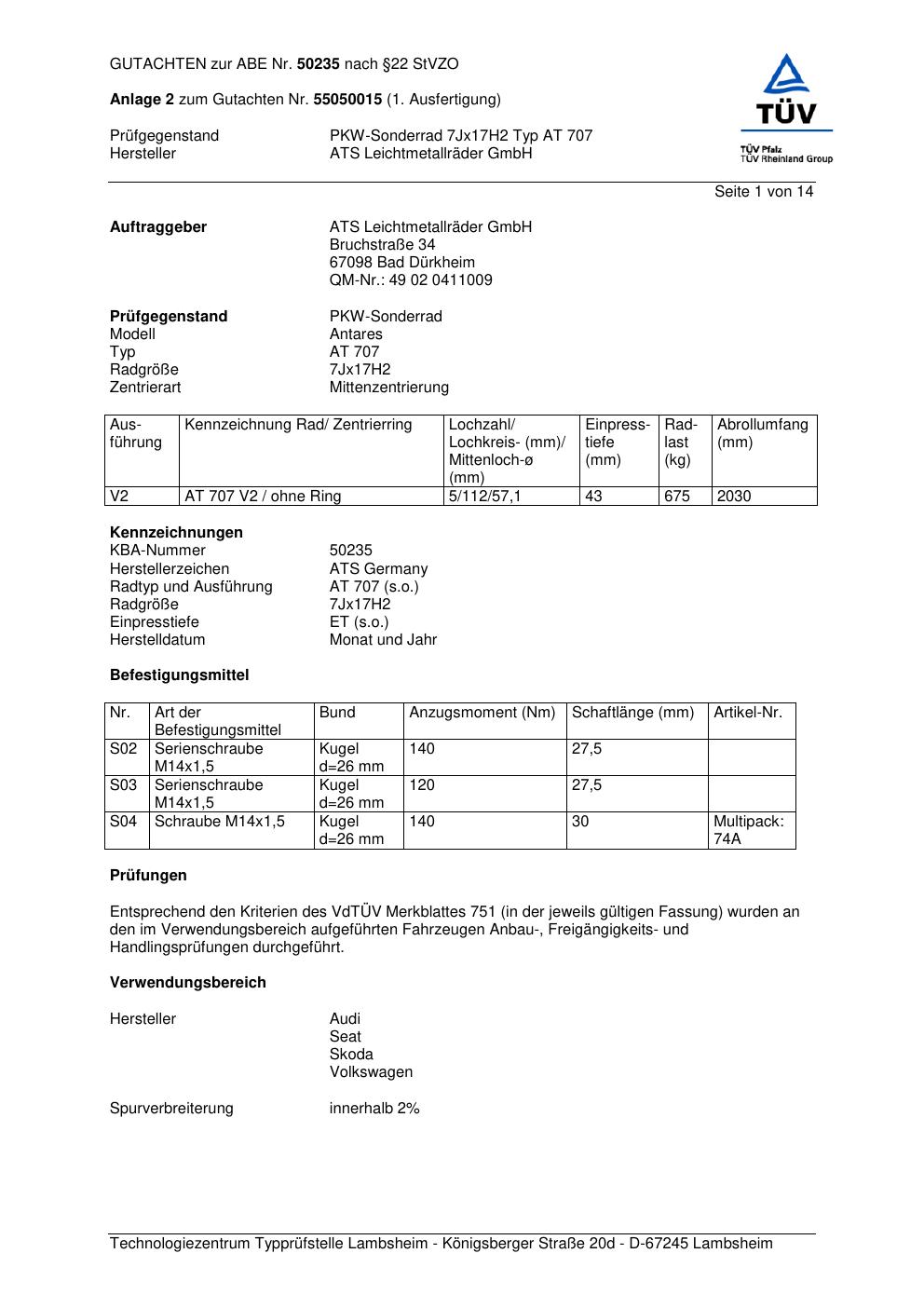 Dieses Gutachten (abe) bezieht sich auf die Alufelge ATS AT 707 in der Ausführung 7Jx17 ET 0, Mittenloch 0 mm (KBA 50235). Im PDF findest du typischerweise zulässige Reifengrößen, Auflagen/Anbauhinweise und – je nach Dokument – Hinweise zur Eintragung.
