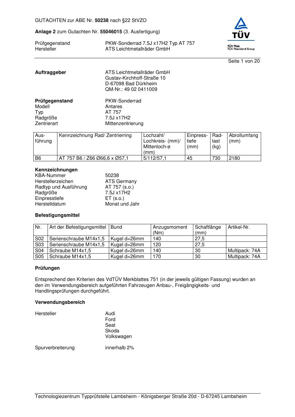 Dieses Gutachten (abe) bezieht sich auf die Alufelge ATS AT 757 in der Ausführung 7.5Jx17 ET 0, Mittenloch 0 mm (KBA 50238). Im PDF findest du typischerweise zulässige Reifengrößen, Auflagen/Anbauhinweise und – je nach Dokument – Hinweise zur Eintragung.