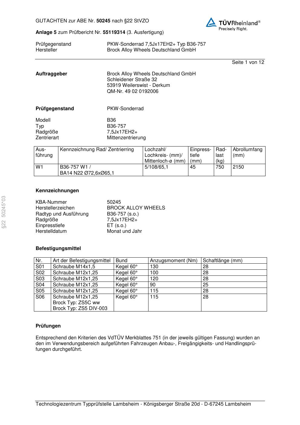 Dieses Gutachten (abe) bezieht sich auf die Alufelge Brock B36-75 7 in der Ausführung ET 0, Mittenloch 0 mm (KBA 50245). Im PDF findest du typischerweise zulässige Reifengrößen, Auflagen/Anbauhinweise und – je nach Dokument – Hinweise zur Eintragung.