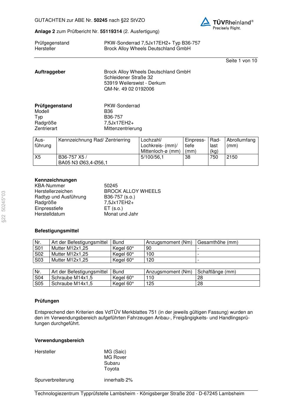 Dieses Gutachten (abe) bezieht sich auf die Alufelge Brock B36-75 7 in der Ausführung ET 0, Mittenloch 0 mm (KBA 50245). Im PDF findest du typischerweise zulässige Reifengrößen, Auflagen/Anbauhinweise und – je nach Dokument – Hinweise zur Eintragung.