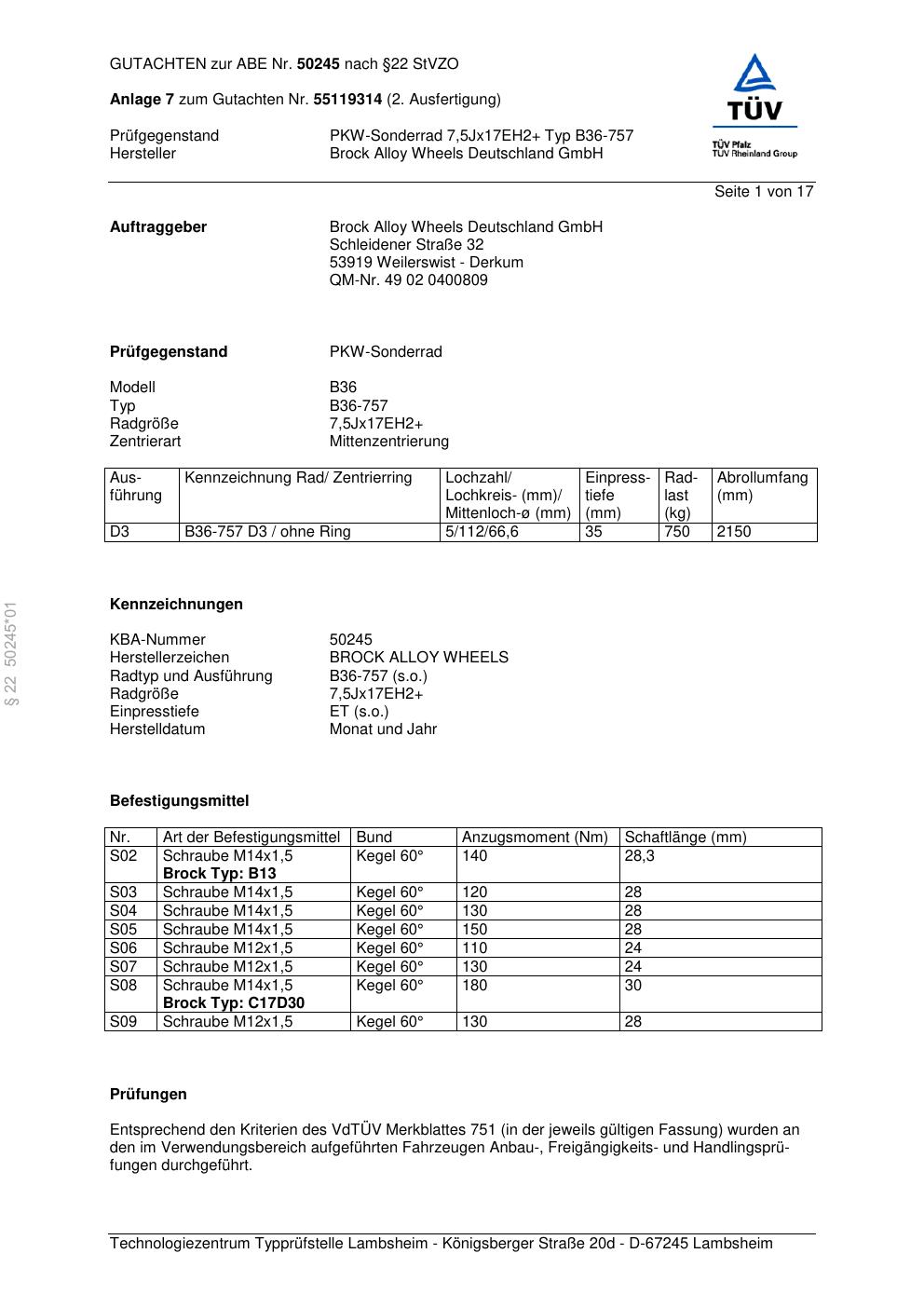 Dieses Gutachten (abe) bezieht sich auf die Alufelge Brock B36-75 7 in der Ausführung ET 0, Mittenloch 0 mm (KBA 50245). Im PDF findest du typischerweise zulässige Reifengrößen, Auflagen/Anbauhinweise und – je nach Dokument – Hinweise zur Eintragung.