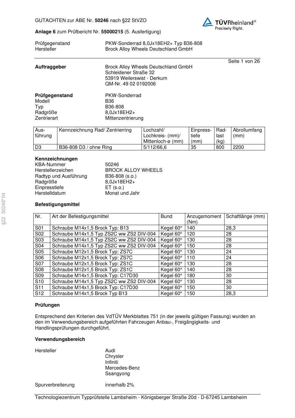 Dieses Gutachten (abe) bezieht sich auf die Alufelge Brock B36-80 8 in der Ausführung ET 0, Mittenloch 0 mm (KBA 50246). Im PDF findest du typischerweise zulässige Reifengrößen, Auflagen/Anbauhinweise und – je nach Dokument – Hinweise zur Eintragung.