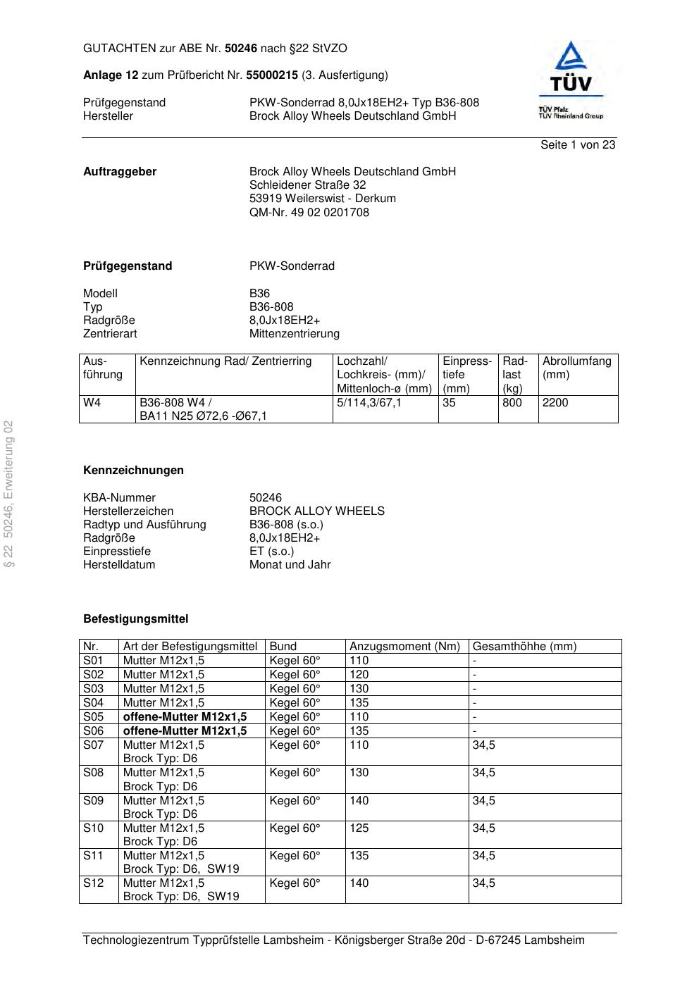 Dieses Gutachten (abe) bezieht sich auf die Alufelge Brock B36-808 in der Ausführung ET 0, Mittenloch 0 mm (KBA 50246). Im PDF findest du typischerweise zulässige Reifengrößen, Auflagen/Anbauhinweise und – je nach Dokument – Hinweise zur Eintragung.