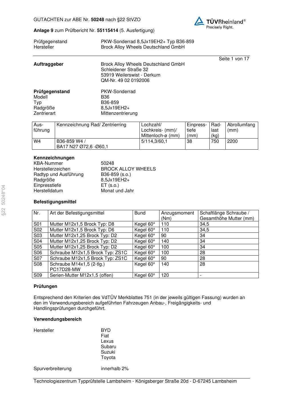 Dieses Gutachten (abe) bezieht sich auf die Alufelge Brock B36-85 9 in der Ausführung ET 0, Mittenloch 0 mm (KBA 50248). Im PDF findest du typischerweise zulässige Reifengrößen, Auflagen/Anbauhinweise und – je nach Dokument – Hinweise zur Eintragung.