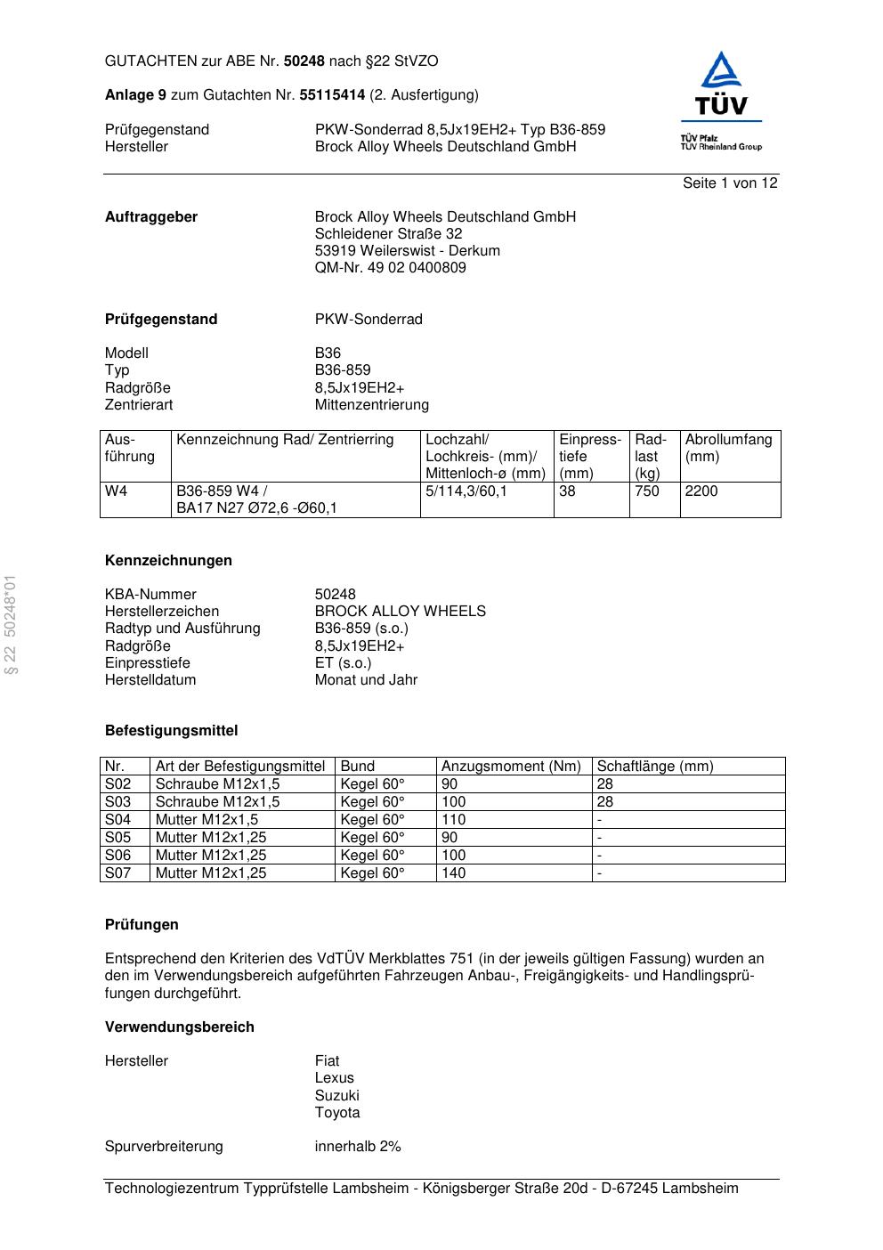 Dieses Gutachten (abe) bezieht sich auf die Alufelge Brock B36-85 9 in der Ausführung ET 0, Mittenloch 0 mm (KBA 50248). Im PDF findest du typischerweise zulässige Reifengrößen, Auflagen/Anbauhinweise und – je nach Dokument – Hinweise zur Eintragung.
