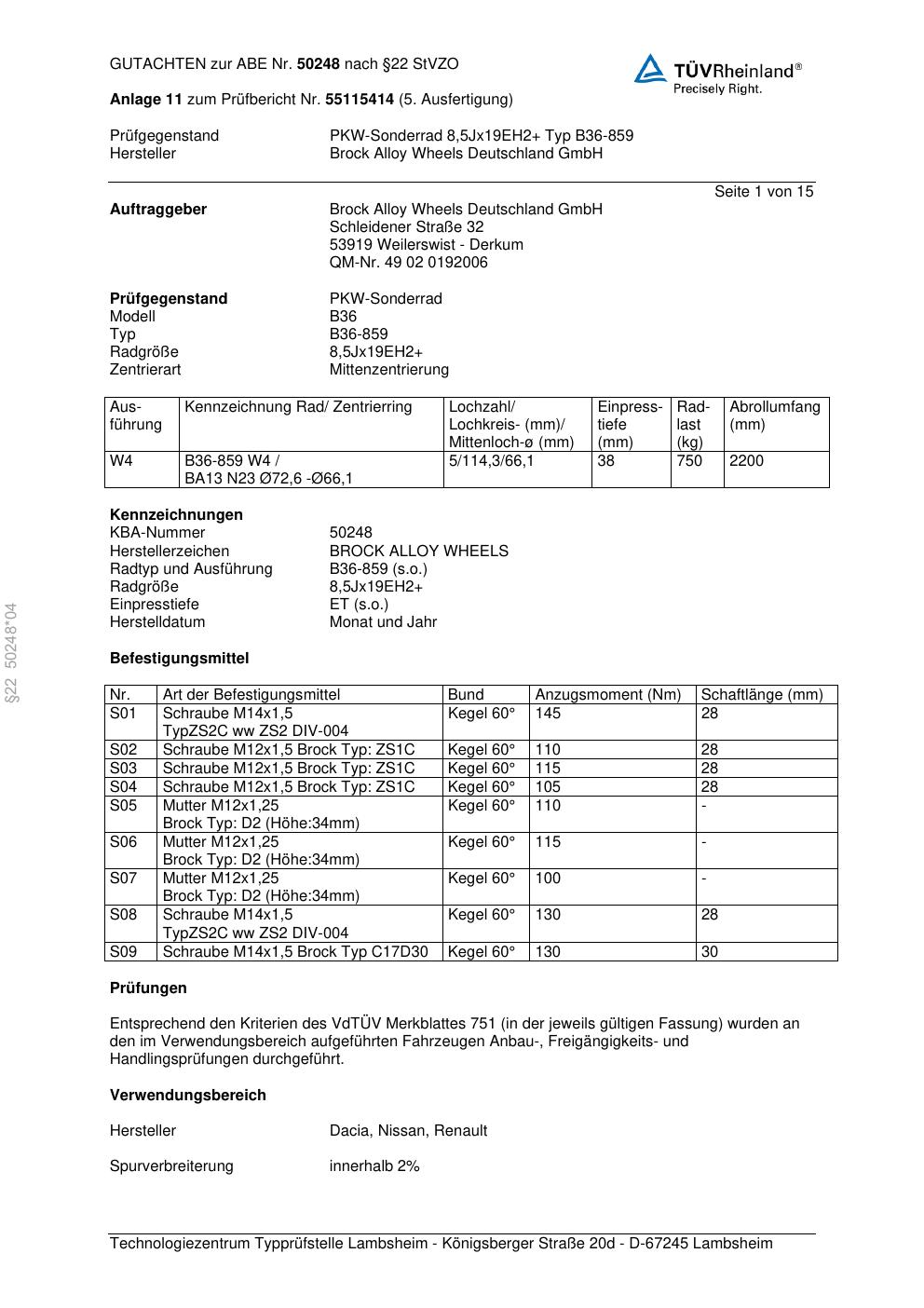 Dieses Gutachten (abe) bezieht sich auf die Alufelge Brock B36-85 9 in der Ausführung ET 0, Mittenloch 0 mm (KBA 50248). Im PDF findest du typischerweise zulässige Reifengrößen, Auflagen/Anbauhinweise und – je nach Dokument – Hinweise zur Eintragung.