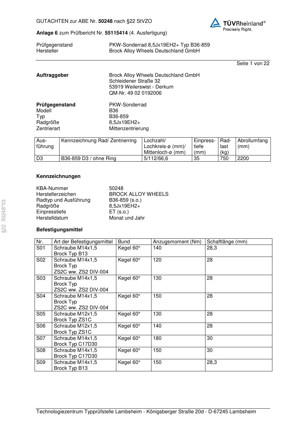 Dieses Gutachten (abe) bezieht sich auf die Alufelge Brock B36-85 9 in der Ausführung ET 0, Mittenloch 0 mm (KBA 50248). Im PDF findest du typischerweise zulässige Reifengrößen, Auflagen/Anbauhinweise und – je nach Dokument – Hinweise zur Eintragung.