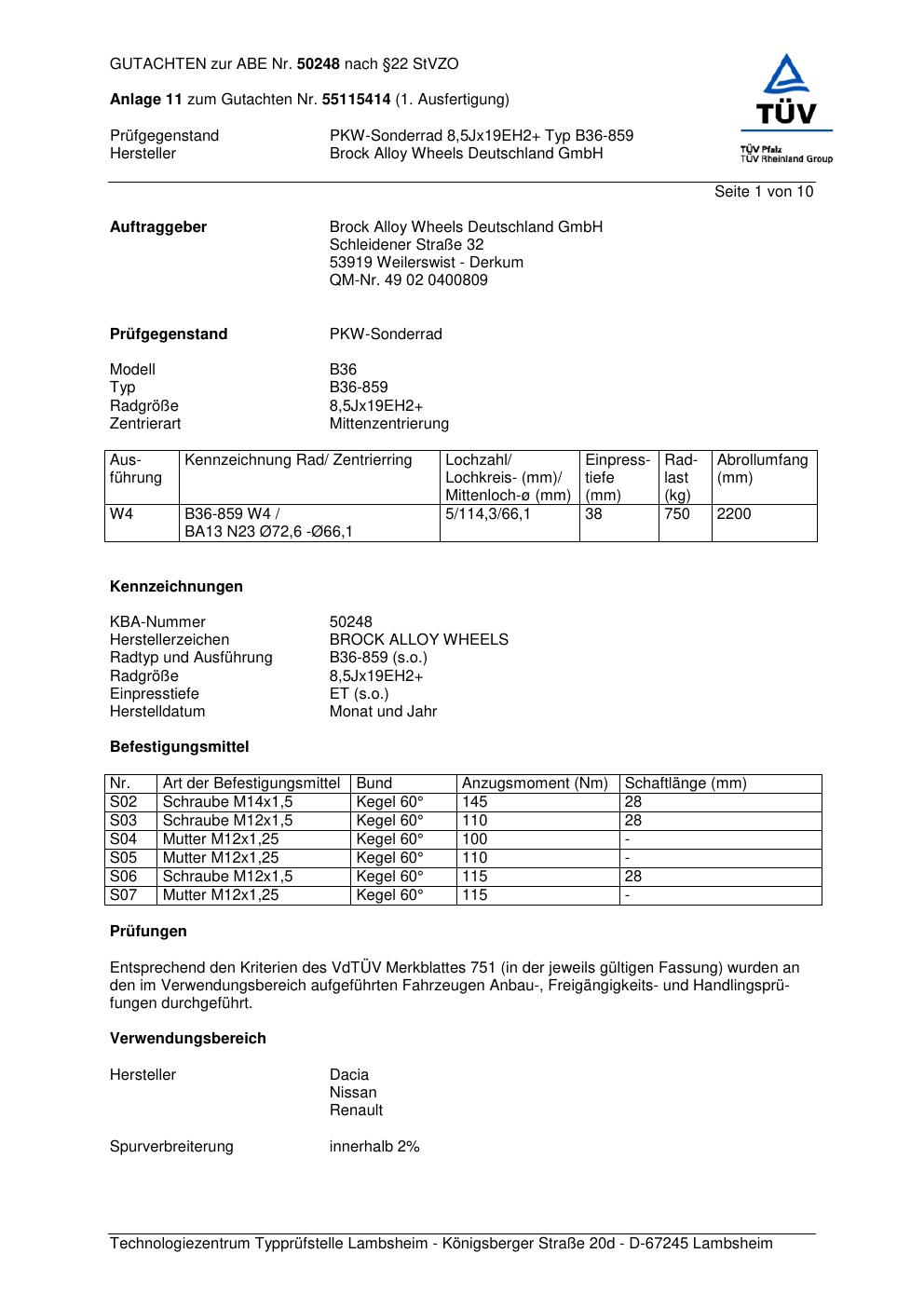 Dieses Gutachten (abe) bezieht sich auf die Alufelge Brock B36-85 9 in der Ausführung 8.5Jx19 ET 0, Mittenloch 0 mm (KBA 50248). Im PDF findest du typischerweise zulässige Reifengrößen, Auflagen/Anbauhinweise und – je nach Dokument – Hinweise zur Eintragung.