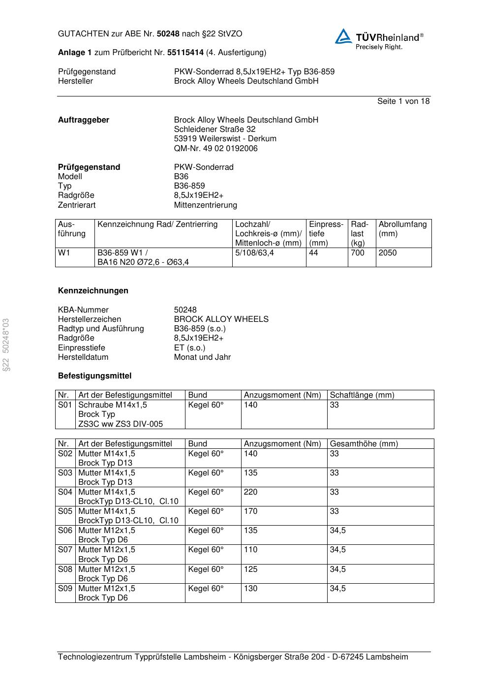 Dieses Gutachten (abe) bezieht sich auf die Alufelge Brock B36-85 9 in der Ausführung 8.5Jx21 ET 0, Mittenloch 0 mm (KBA 50248). Im PDF findest du typischerweise zulässige Reifengrößen, Auflagen/Anbauhinweise und – je nach Dokument – Hinweise zur Eintragung.