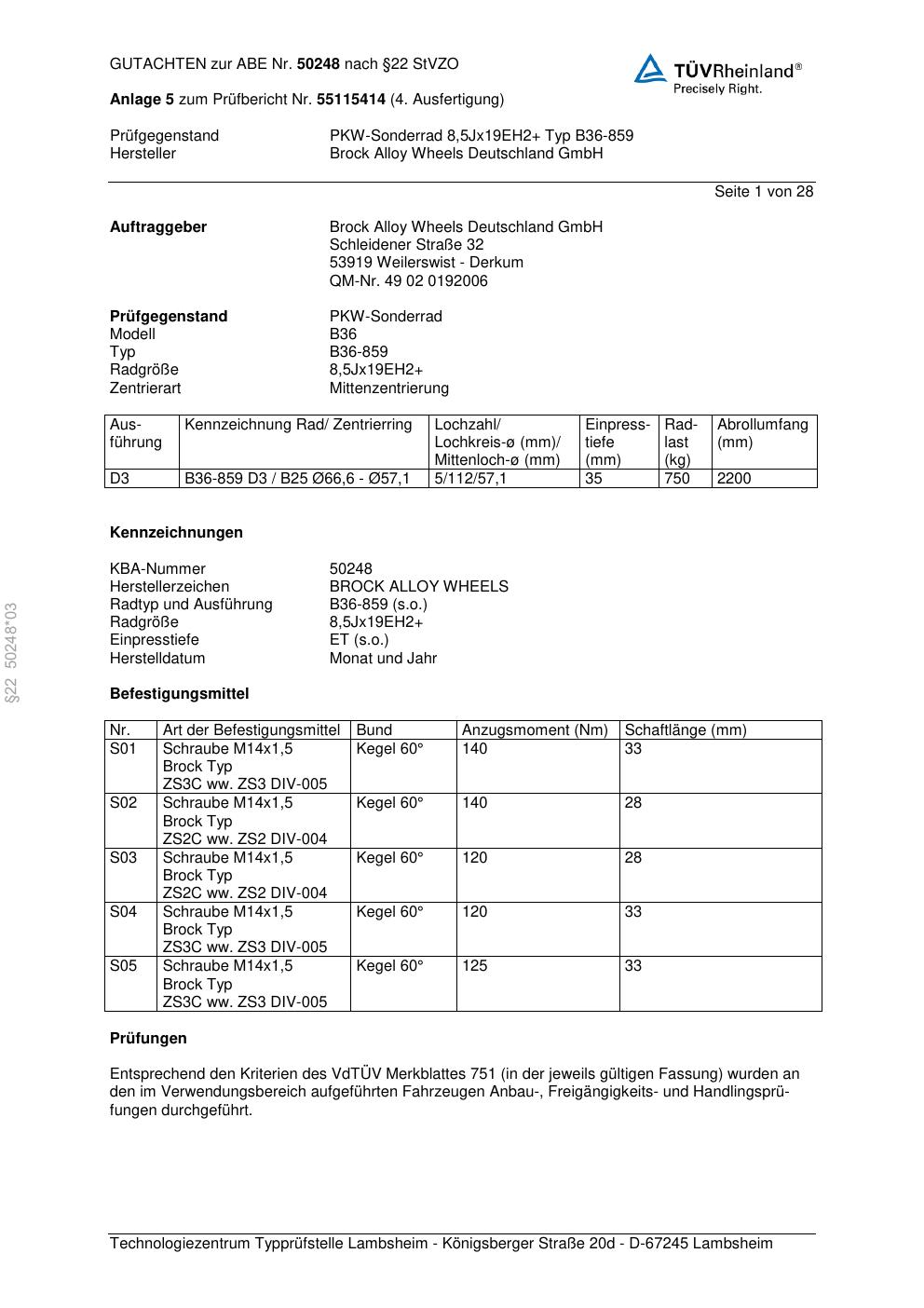 Dieses Gutachten (abe) bezieht sich auf die Alufelge Brock B36-85 9 in der Ausführung 8.5Jx19 ET 0, Mittenloch 0 mm (KBA 50248). Im PDF findest du typischerweise zulässige Reifengrößen, Auflagen/Anbauhinweise und – je nach Dokument – Hinweise zur Eintragung.