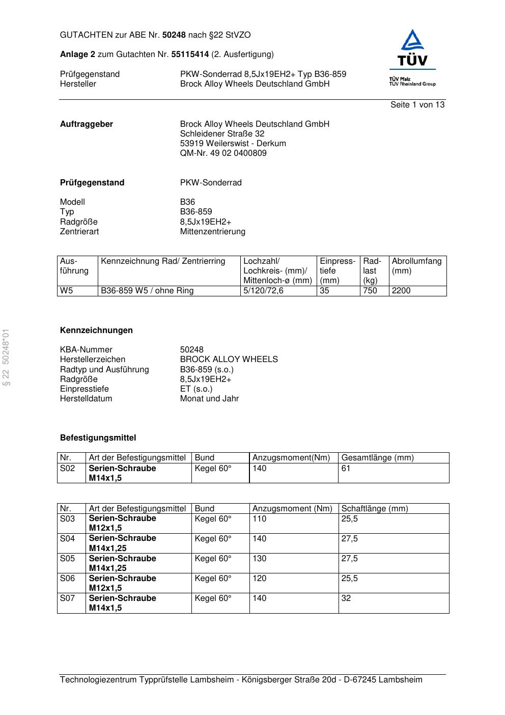 Dieses Gutachten (abe) bezieht sich auf die Alufelge Brock B36-85 9 in der Ausführung ET 0, Mittenloch 0 mm (KBA 50248). Im PDF findest du typischerweise zulässige Reifengrößen, Auflagen/Anbauhinweise und – je nach Dokument – Hinweise zur Eintragung.