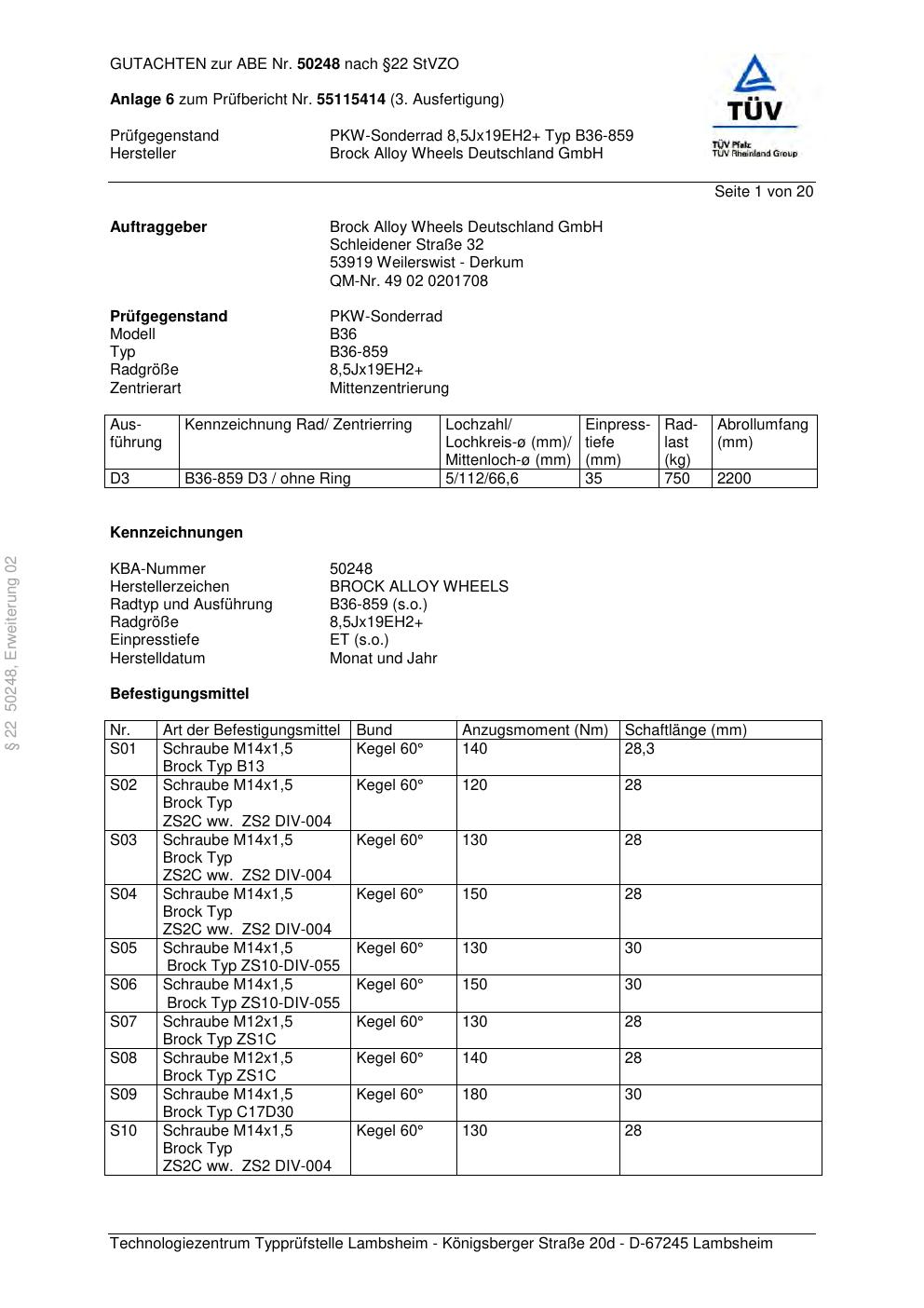 Dieses Gutachten (abe) bezieht sich auf die Alufelge Brock B36-859 in der Ausführung ET 0, Mittenloch 0 mm (KBA 50248). Im PDF findest du typischerweise zulässige Reifengrößen, Auflagen/Anbauhinweise und – je nach Dokument – Hinweise zur Eintragung.