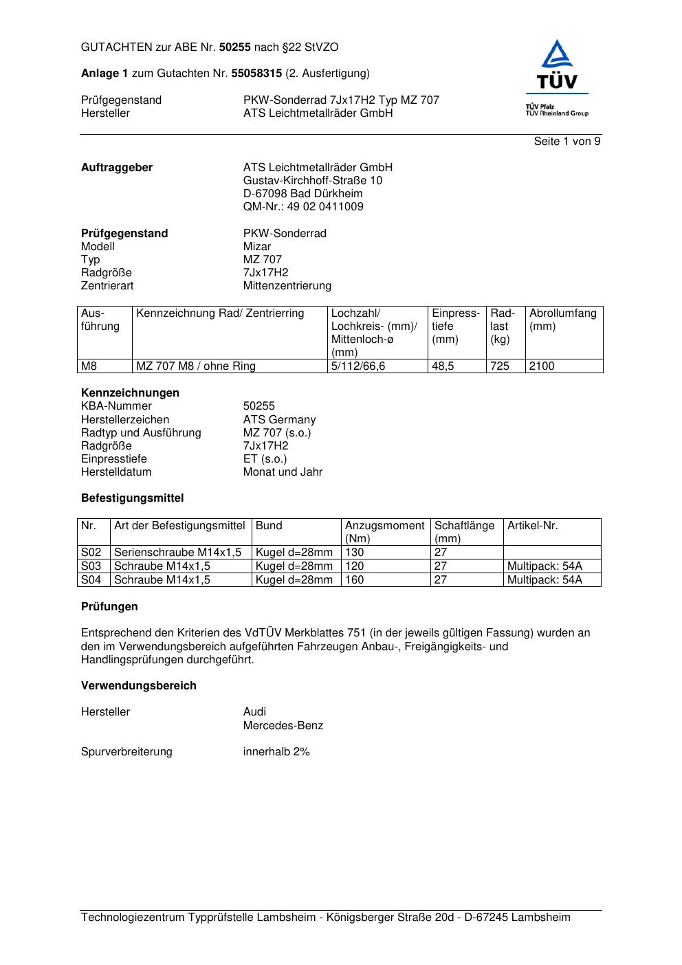 Dieses Gutachten (abe) bezieht sich auf die Alufelge ATS MZ 707 in der Ausführung 7Jx17 ET 0, Mittenloch 0 mm (KBA 50255). Im PDF findest du typischerweise zulässige Reifengrößen, Auflagen/Anbauhinweise und – je nach Dokument – Hinweise zur Eintragung.