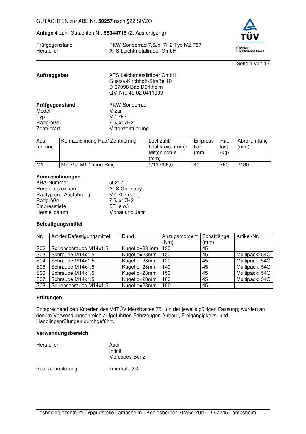 Dieses Gutachten (abe) bezieht sich auf die Alufelge ATS MZ 757 in der Ausführung 7.5Jx17 ET 0, Mittenloch 0 mm (KBA 50257). Im PDF findest du typischerweise zulässige Reifengrößen, Auflagen/Anbauhinweise und – je nach Dokument – Hinweise zur Eintragung.