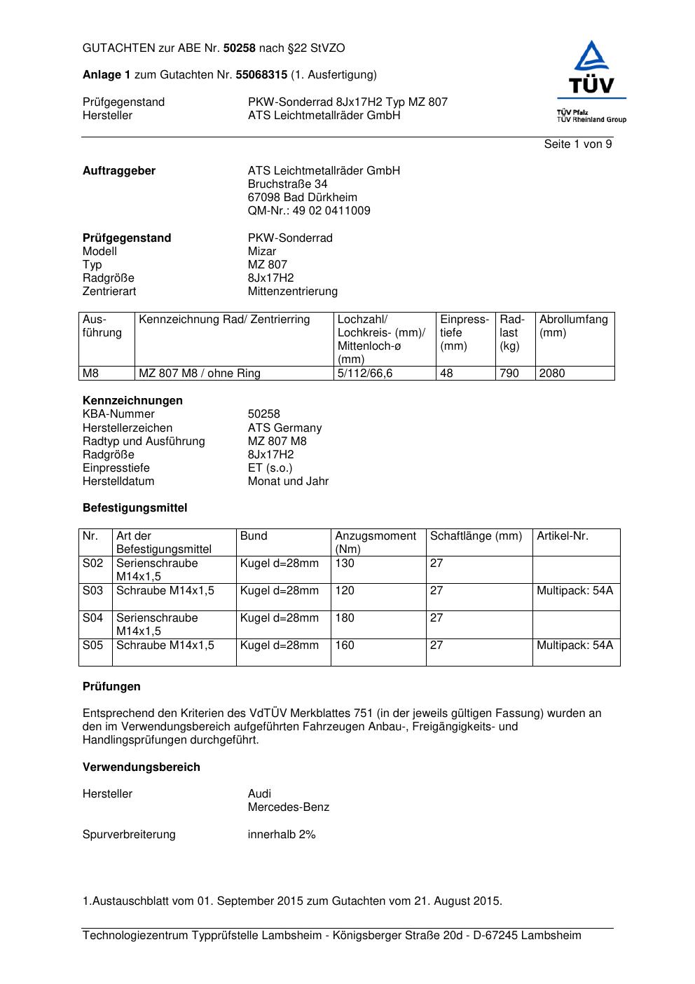 Dieses Gutachten (abe) bezieht sich auf die Alufelge ATS MZ 807 in der Ausführung 8Jx17 ET 0, Mittenloch 0 mm (KBA 50258). Im PDF findest du typischerweise zulässige Reifengrößen, Auflagen/Anbauhinweise und – je nach Dokument – Hinweise zur Eintragung.
