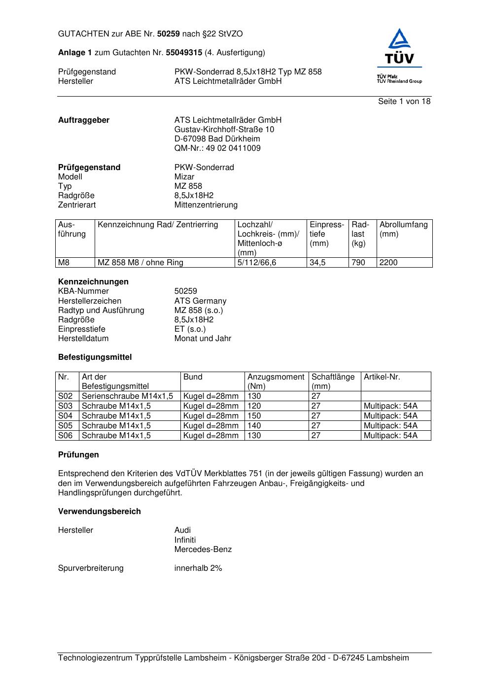 Dieses Gutachten (abe) bezieht sich auf die Alufelge ATS MZ 858 in der Ausführung 8.5Jx18 ET 0, Mittenloch 0 mm (KBA 50259). Im PDF findest du typischerweise zulässige Reifengrößen, Auflagen/Anbauhinweise und – je nach Dokument – Hinweise zur Eintragung.