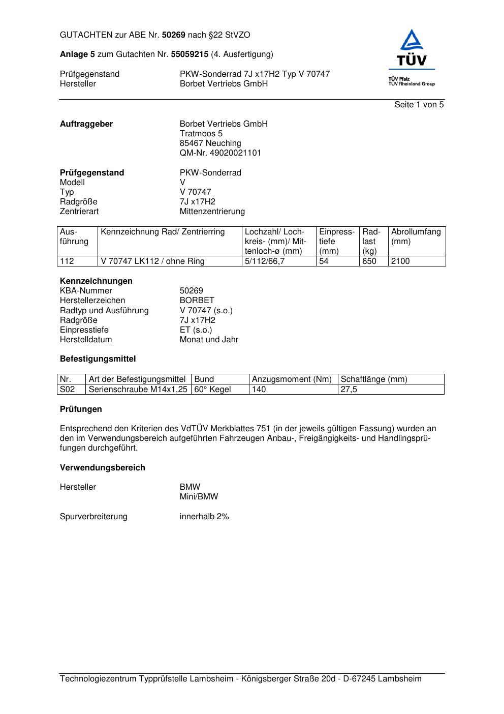 Dieses Gutachten (abe) bezieht sich auf die Alufelge Borbet V 70747 in der Ausführung 7Jx17 ET 0, Mittenloch 0 mm (KBA 50269). Im PDF findest du typischerweise zulässige Reifengrößen, Auflagen/Anbauhinweise und – je nach Dokument – Hinweise zur Eintragung.