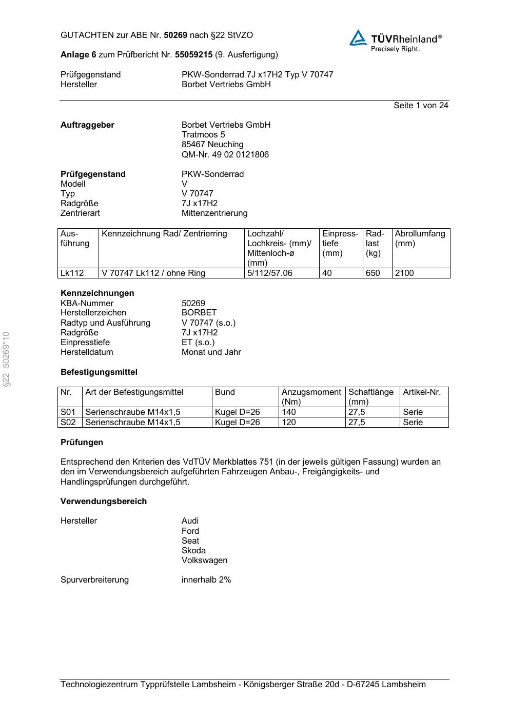 Dieses Gutachten (abe) bezieht sich auf die Alufelge Borbet V 70747 in der Ausführung 7Jx17 ET 0, Mittenloch 0 mm (KBA 50269). Im PDF findest du typischerweise zulässige Reifengrößen, Auflagen/Anbauhinweise und – je nach Dokument – Hinweise zur Eintragung.