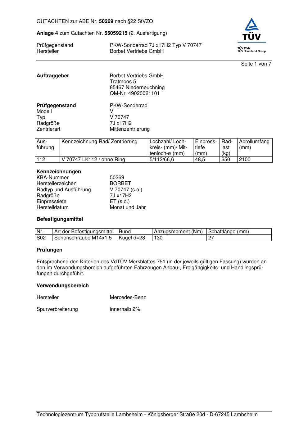 Dieses Gutachten (abe) bezieht sich auf die Alufelge Borbet V 70747 in der Ausführung 7Jx17 ET 0, Mittenloch 0 mm (KBA 50269). Im PDF findest du typischerweise zulässige Reifengrößen, Auflagen/Anbauhinweise und – je nach Dokument – Hinweise zur Eintragung.