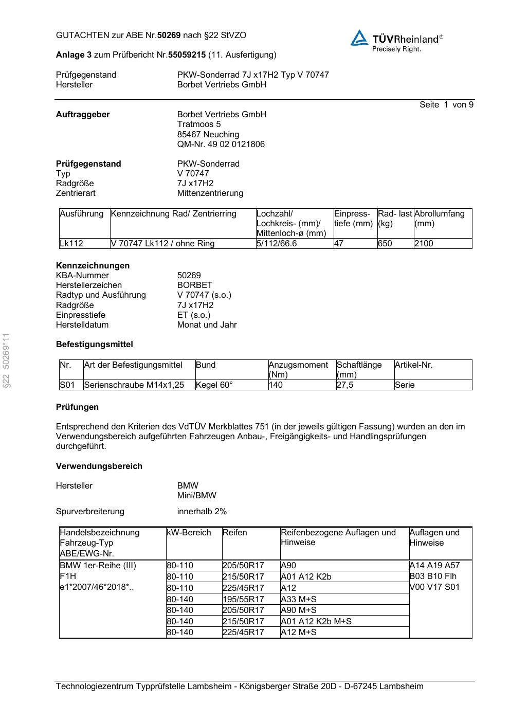 Dieses Gutachten (abe) bezieht sich auf die Alufelge Borbet V 70747 in der Ausführung 7Jx17 ET 0, Mittenloch 0 mm (KBA 50269). Im PDF findest du typischerweise zulässige Reifengrößen, Auflagen/Anbauhinweise und – je nach Dokument – Hinweise zur Eintragung.