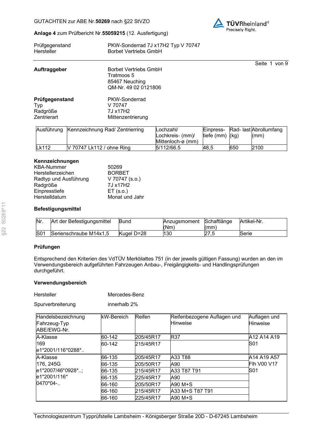 Dieses Gutachten (abe) bezieht sich auf die Alufelge Borbet V 70747 in der Ausführung 7Jx17 ET 0, Mittenloch 0 mm (KBA 50269). Im PDF findest du typischerweise zulässige Reifengrößen, Auflagen/Anbauhinweise und – je nach Dokument – Hinweise zur Eintragung.