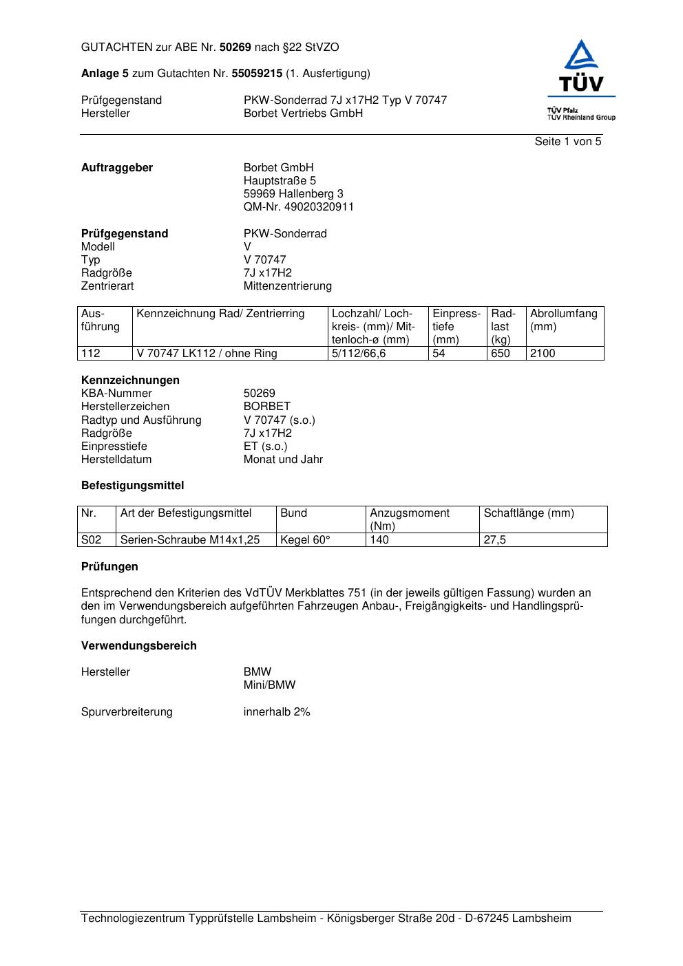 Dieses Gutachten (abe) bezieht sich auf die Alufelge Borbet V 70747 in der Ausführung 7Jx17 ET 0, Mittenloch 0 mm (KBA 50269). Im PDF findest du typischerweise zulässige Reifengrößen, Auflagen/Anbauhinweise und – je nach Dokument – Hinweise zur Eintragung.
