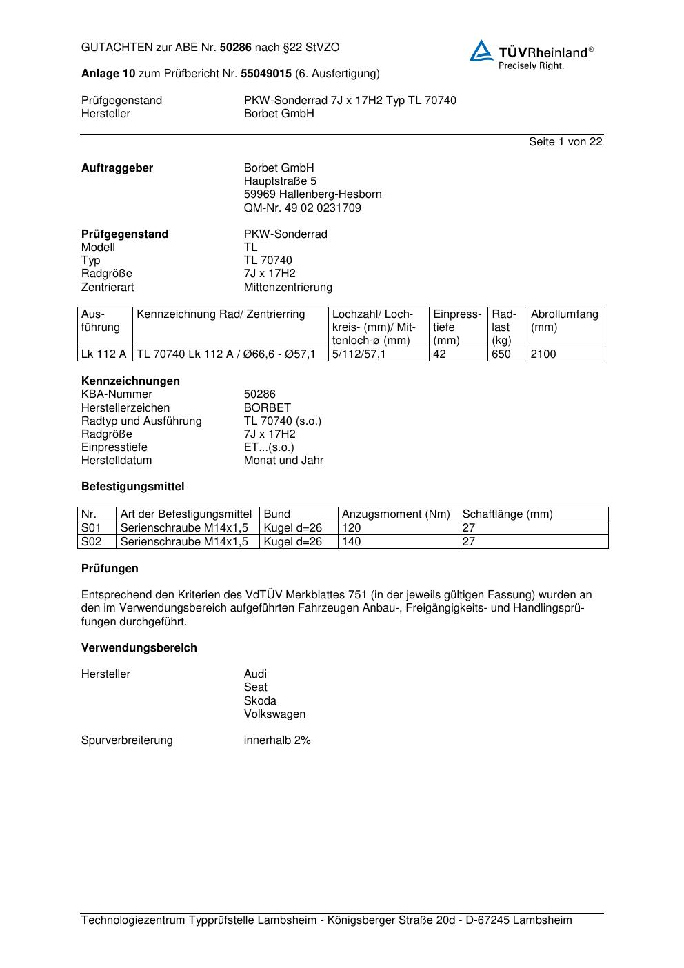 Dieses Gutachten (abe) bezieht sich auf die Alufelge Borbet TL 70740 in der Ausführung 7Jx17 ET 0, Mittenloch 0 mm (KBA 50286). Im PDF findest du typischerweise zulässige Reifengrößen, Auflagen/Anbauhinweise und – je nach Dokument – Hinweise zur Eintragung.