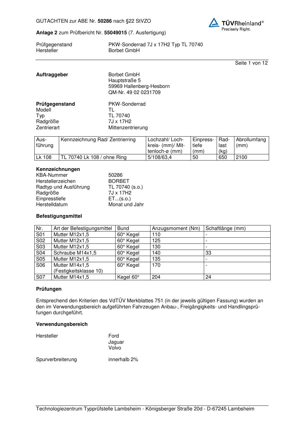 Dieses Gutachten (abe) bezieht sich auf die Alufelge Borbet TL 70740 in der Ausführung 7Jx17 ET 0, Mittenloch 0 mm (KBA 50286). Im PDF findest du typischerweise zulässige Reifengrößen, Auflagen/Anbauhinweise und – je nach Dokument – Hinweise zur Eintragung.