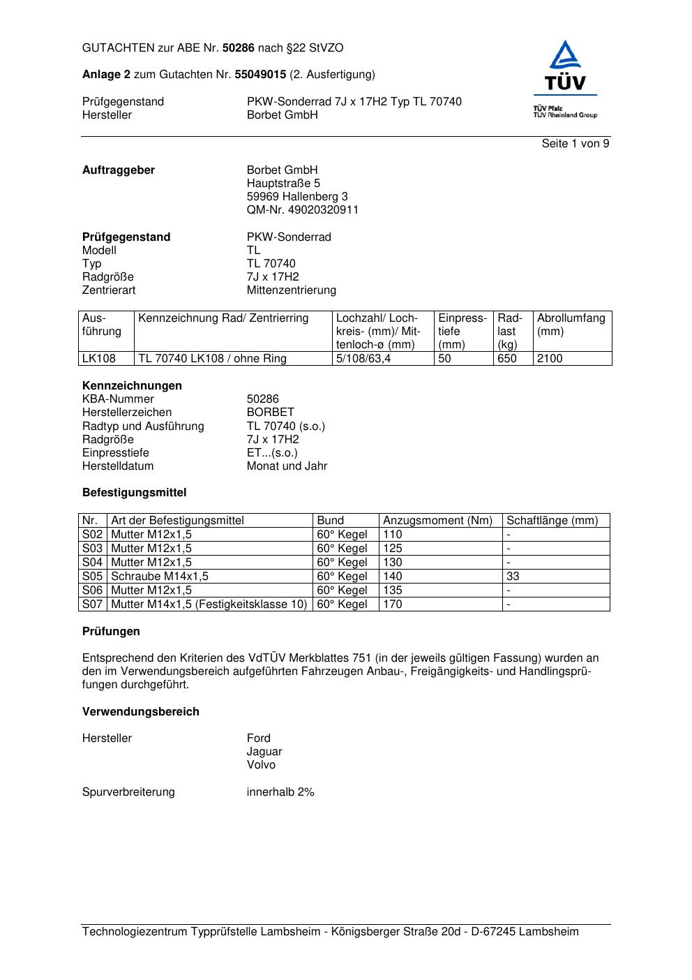 Dieses Gutachten (abe) bezieht sich auf die Alufelge Borbet TL 70740 in der Ausführung 7Jx17 ET 0, Mittenloch 0 mm (KBA 50286). Im PDF findest du typischerweise zulässige Reifengrößen, Auflagen/Anbauhinweise und – je nach Dokument – Hinweise zur Eintragung.