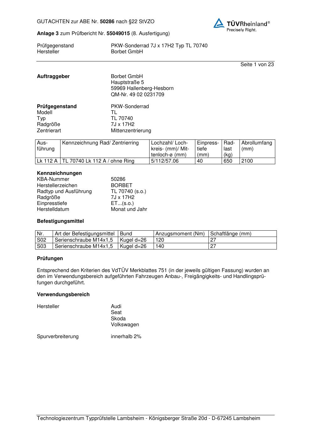 Dieses Gutachten (abe) bezieht sich auf die Alufelge Borbet TL 70740 in der Ausführung 7Jx17 ET 0, Mittenloch 0 mm (KBA 50286). Im PDF findest du typischerweise zulässige Reifengrößen, Auflagen/Anbauhinweise und – je nach Dokument – Hinweise zur Eintragung.