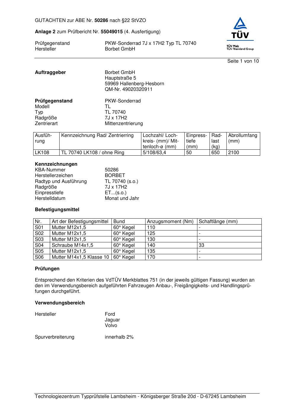 Dieses Gutachten (abe) bezieht sich auf die Alufelge Borbet TL 70740 in der Ausführung 7Jx17 ET 0, Mittenloch 0 mm (KBA 50286). Im PDF findest du typischerweise zulässige Reifengrößen, Auflagen/Anbauhinweise und – je nach Dokument – Hinweise zur Eintragung.