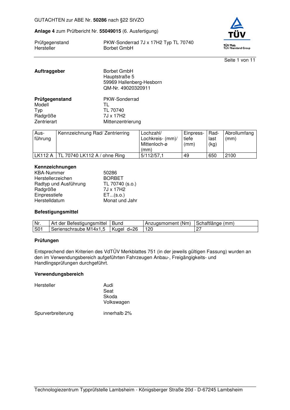 Dieses Gutachten (abe) bezieht sich auf die Alufelge Borbet TL 70740 in der Ausführung 7Jx17 ET 0, Mittenloch 0 mm (KBA 50286). Im PDF findest du typischerweise zulässige Reifengrößen, Auflagen/Anbauhinweise und – je nach Dokument – Hinweise zur Eintragung.