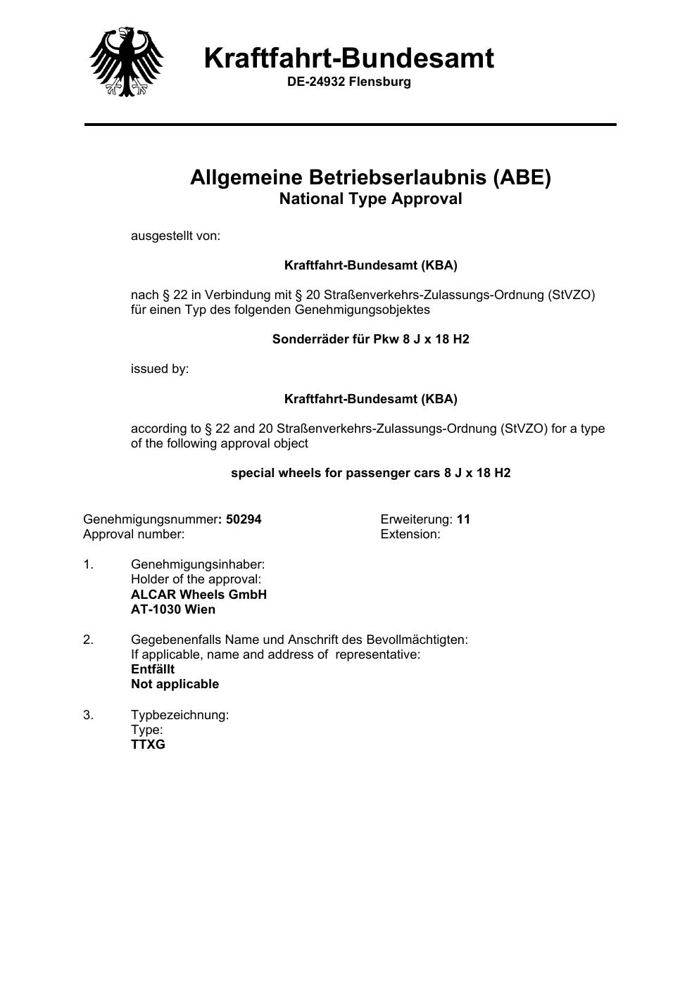 Dieses Gutachten (abe) bezieht sich auf die Alufelge ATS UN8080 in der Ausführung 8Jx18 ET 0, Mittenloch 0 mm (KBA 50294). Im PDF findest du typischerweise zulässige Reifengrößen, Auflagen/Anbauhinweise und – je nach Dokument – Hinweise zur Eintragung.