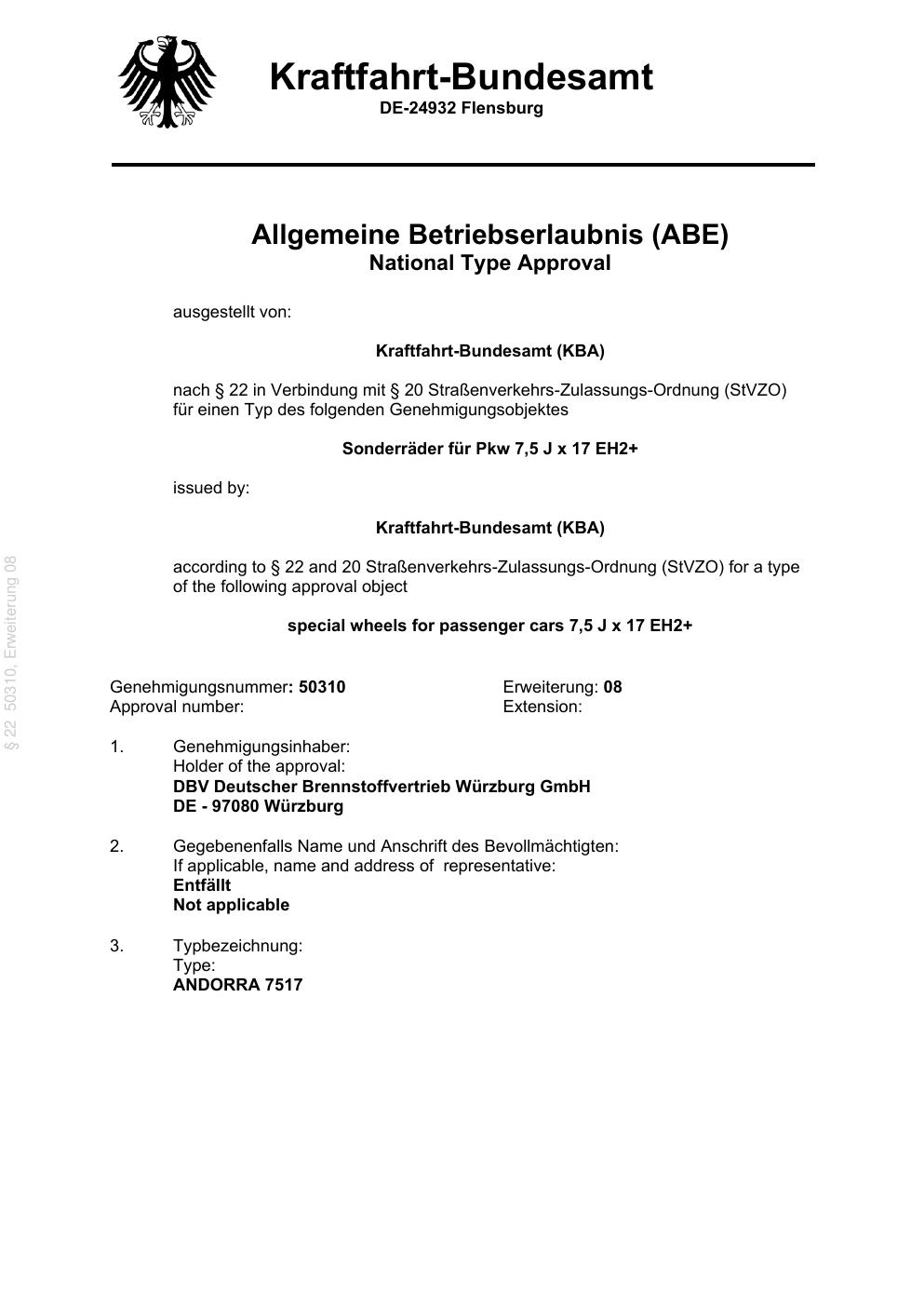 Dieses Gutachten (abe) bezieht sich auf die Alufelge ATS UN8080 in der Ausführung 7.5Jx17 ET 0, Mittenloch 0 mm (KBA 50310). Im PDF findest du typischerweise zulässige Reifengrößen, Auflagen/Anbauhinweise und – je nach Dokument – Hinweise zur Eintragung.