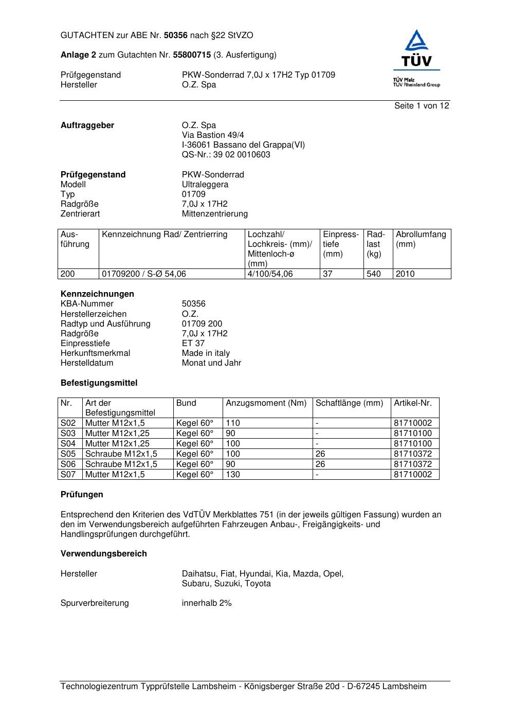 Dieses Gutachten (abe) bezieht sich auf die Alufelge ATS 01709 in der Ausführung 7Jx17 ET 0, Mittenloch 0 mm (KBA 50356). Im PDF findest du typischerweise zulässige Reifengrößen, Auflagen/Anbauhinweise und – je nach Dokument – Hinweise zur Eintragung.