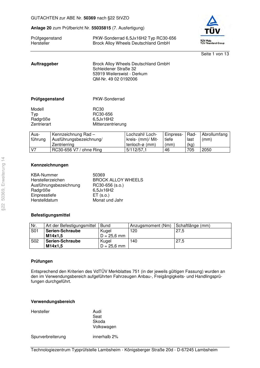 Dieses Gutachten (abe) bezieht sich auf die Alufelge Brock RC30-656 in der Ausführung 6.5Jx16 ET 0, Mittenloch 0 mm (KBA 50369). Im PDF findest du typischerweise zulässige Reifengrößen, Auflagen/Anbauhinweise und – je nach Dokument – Hinweise zur Eintragung.
