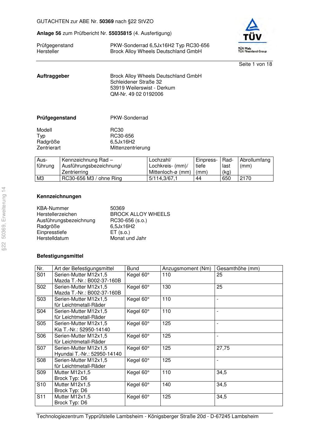 Dieses Gutachten (abe) bezieht sich auf die Alufelge Brock RC30-656 in der Ausführung 6.5Jx16 ET 0, Mittenloch 0 mm (KBA 50369). Im PDF findest du typischerweise zulässige Reifengrößen, Auflagen/Anbauhinweise und – je nach Dokument – Hinweise zur Eintragung.