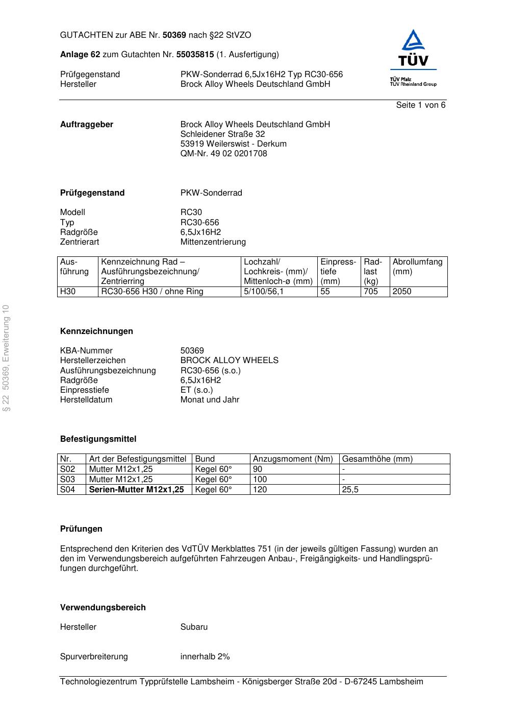 Dieses Gutachten (abe) bezieht sich auf die Alufelge Brock RC30-656 in der Ausführung 6.5Jx16 ET 0, Mittenloch 0 mm (KBA 50369). Im PDF findest du typischerweise zulässige Reifengrößen, Auflagen/Anbauhinweise und – je nach Dokument – Hinweise zur Eintragung.