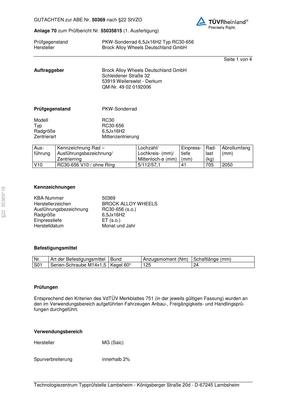 Dieses Gutachten (abe) bezieht sich auf die Alufelge Brock RC30-656 in der Ausführung 6.5Jx16 ET 0, Mittenloch 0 mm (KBA 50369). Im PDF findest du typischerweise zulässige Reifengrößen, Auflagen/Anbauhinweise und – je nach Dokument – Hinweise zur Eintragung.
