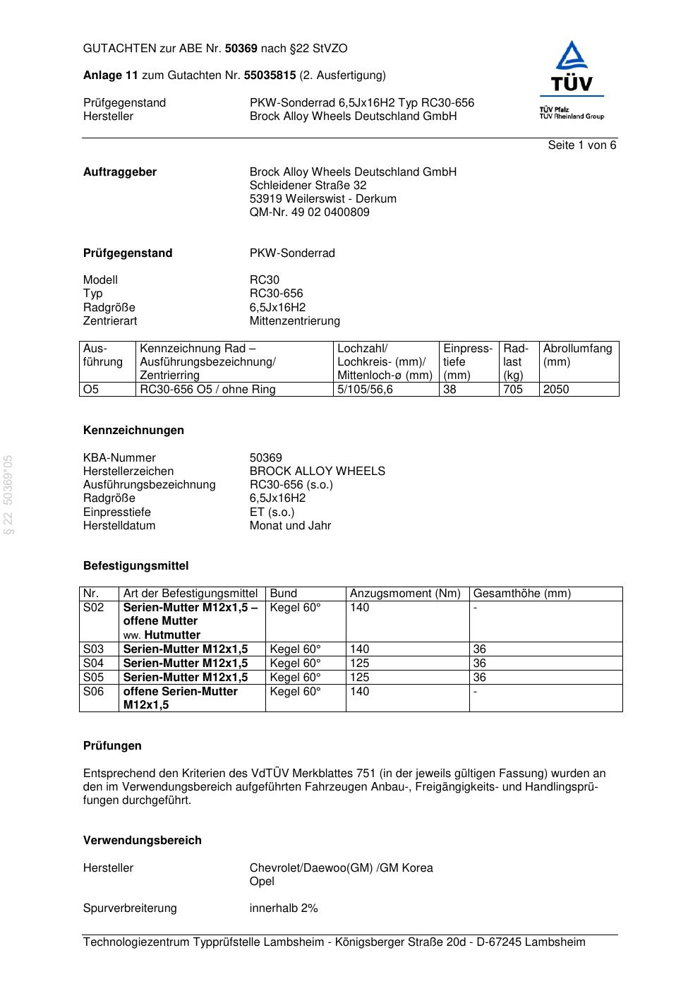 Dieses Gutachten (abe) bezieht sich auf die Alufelge Brock RC30-656 in der Ausführung 6.5Jx16 ET 0, Mittenloch 0 mm (KBA 50369). Im PDF findest du typischerweise zulässige Reifengrößen, Auflagen/Anbauhinweise und – je nach Dokument – Hinweise zur Eintragung.