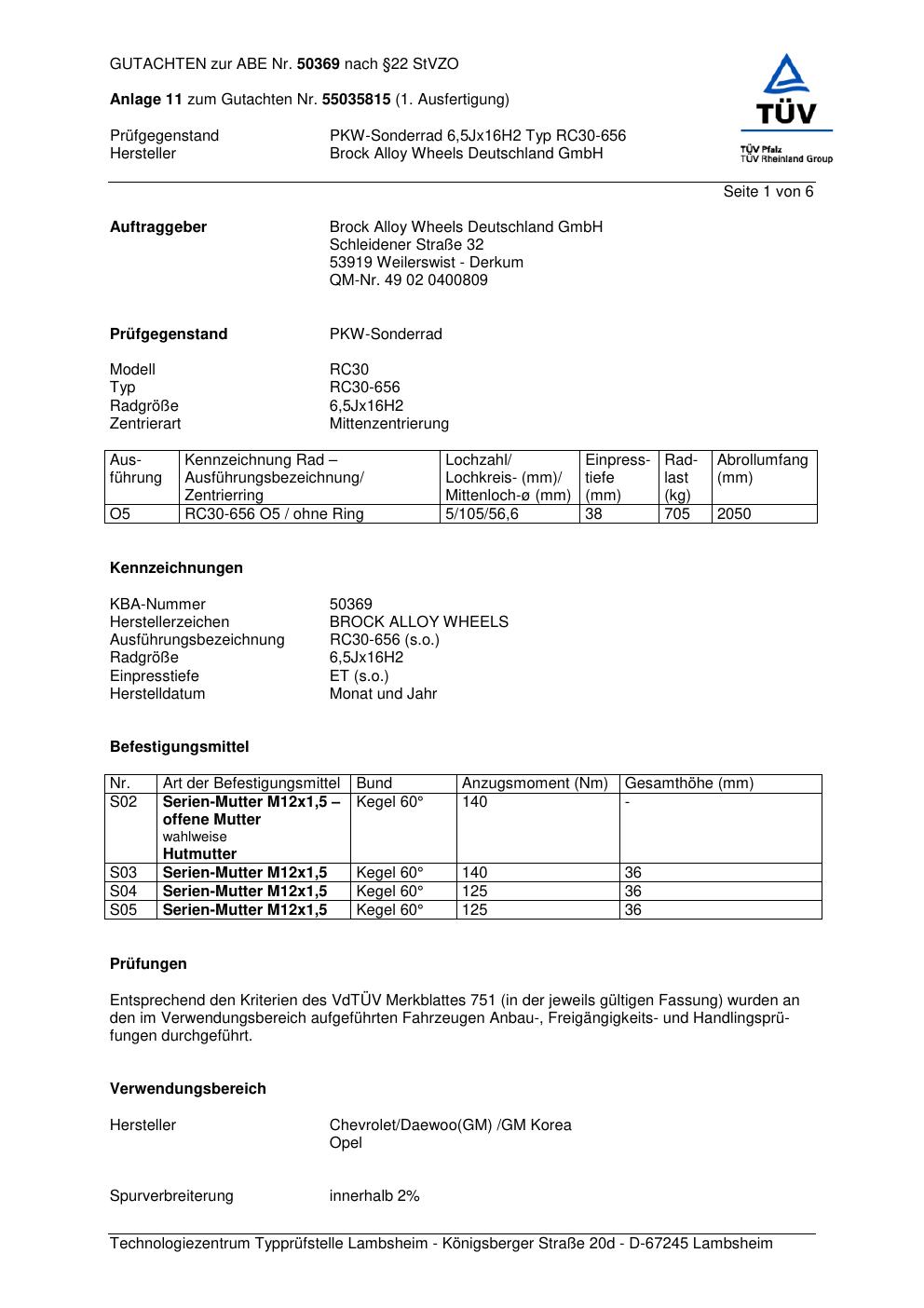 Dieses Gutachten (abe) bezieht sich auf die Alufelge Brock RC30-656 in der Ausführung 6.5Jx16 ET 0, Mittenloch 0 mm (KBA 50369). Im PDF findest du typischerweise zulässige Reifengrößen, Auflagen/Anbauhinweise und – je nach Dokument – Hinweise zur Eintragung.